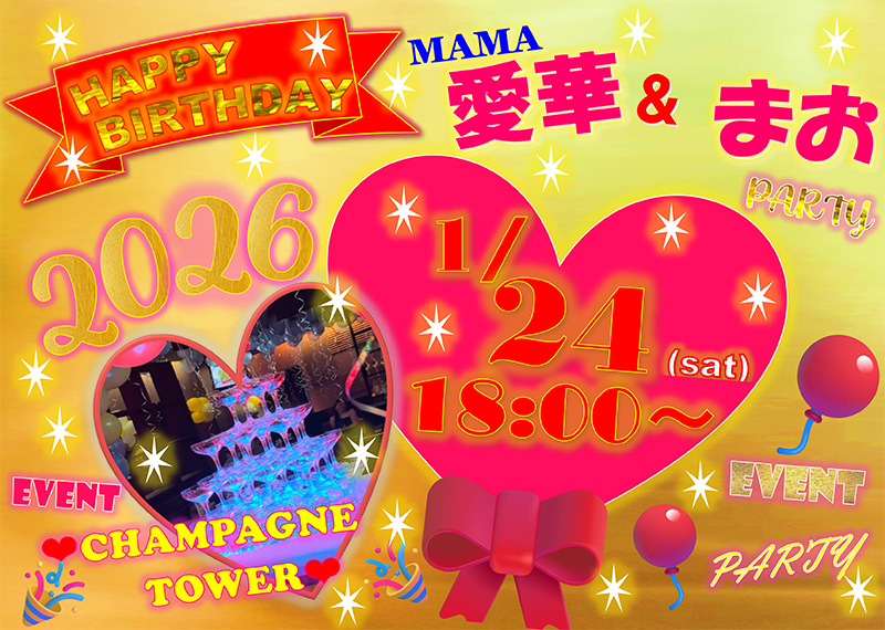 1月24日(土)18:00から愛華ママ&まおのバースディパーティを開催いたします🎂🍾